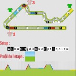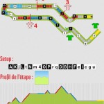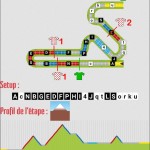 Étape de plat avec deux petites côtes, histoire de départager le maillot à pois. Parfaite pour apprivoiser le jeu et les quelques règles spéciales. Une étape que l’on pourrait qualifier de standard qui encourage les échappées. Ce fut le cas dès le premier tour avec le sprinter vert qui prend une avance immédiate et fait la course seul en tête pratiquement jusqu’à l’arrivée. S’il gagne l’étape, il ne parvient pas à creuser d’écart. Au final, il y aura un regroupement général et seules les bonifications vont permettre d’attribuer le maillot jaune.